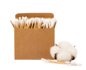 Pąki bawełny w opakowaniach eko kraft izolowane na białym tle. Wymaz z bawełny na białym tle. Kije do higieny nosa i uszu. Bambusowe pąki bawełniane. Przyjazne dla środowiska.