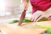 zbliżenie w górę w górę w senior człowiek cięcia w czosnek.