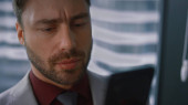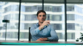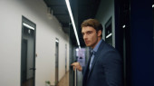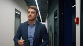 Uśmiechnięty pracownik rozmawiający o zbliżeniu na korytarz smartfona. Pewny siebie prawnik spotyka się na dyżurze z partnerem biznesowym. Przystojny szczęśliwy menedżer opuszcza klienta konsultującego pracę zdalnie.