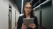 Zdenerwowana bizneswoman sprawdzić smartfona w biurze. Rozczarowana dziewczyna dostaje złe wieści czytając e-mail. Smutny pracownik smsuje w mediach społecznościowych. Nieszczęśliwy analityk finansowy idący na przerwę obiadową w korytarzu.