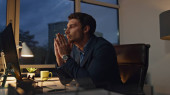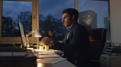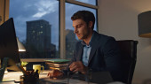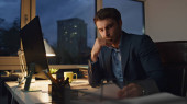 Emerytowany pracownik pracujący w biurze. Zmęczony biznesmen sprawdzający zegarek do późna w pracy. Przystojny, odnoszący sukcesy dyrektor analizujący sprawozdanie finansowe. Strategia planowania Ceo w świetle lampy