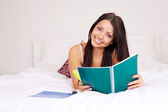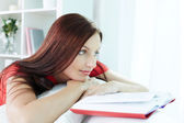 młoda kobieta z notebookiem studia w domu siedzący spokojny na