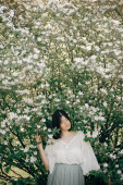 Zdjęcie "młoda ładna brunetka kobieta spacery w ogrodzie i cieszy się z zamkniętymi oczami przez kwitnących krzewów liliowych." może być wykorzystywane do celów osobistych i komercyjnych zgodnie z warunkami zakupionej licencji Royalty-free. Obraz jest dostępny do pobrania w jakości wysokiej rozdzielczości do 5760x3840.