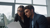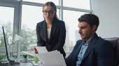 Zestresowani koledzy sprawdzają dokumenty. Szalony biznesmen rzucający papierami w biurze. Nerwowy asystent tłumaczący błąd w raporcie finansowym. Niepowodzenie kierownika przedsiębiorstwa.
