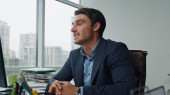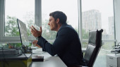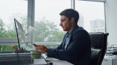 Skupiony biznesmen rozmawiający przez telefon w biurze. Asystent menedżera pomaga przynieść papiery. Udany prawnik wykonawczy dzwoni i rozmawia o interesach z klientem. Zespół ludzi biznesu w pracy