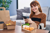 Zdjęcie "Młoda brunetka jedzenie zabrać jedzenie w domu wskazując palcem na siebie uśmiechnięty szczęśliwy i dumny " może być wykorzystywane do celów osobistych i komercyjnych zgodnie z warunkami zakupionej licencji Royalty-free. Obraz jest dostępny do pobrania w jakości wysokiej rozdzielczości do 5760x3840.