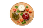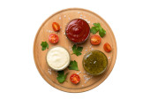 Wiele różnych sosów i ziół na stole, płaski widok leżał na górze. sosy na talerzu, zdrowa koncepcja.