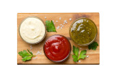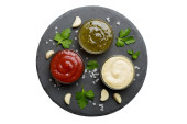 Zdjęcie "Wiele różnych sosów i ziół na stole, płaski widok leżał na górze. sosy na talerzu, zdrowa koncepcja." może być wykorzystywane do celów osobistych i komercyjnych zgodnie z warunkami zakupionej licencji Royalty-free. Obraz jest dostępny do pobrania w jakości wysokiej rozdzielczości do 5760x3840.