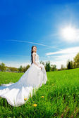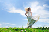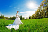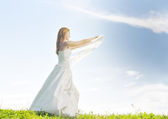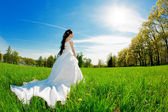 piękna brunetka dama w polu pszenicy na zachód słońca