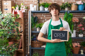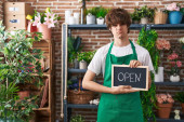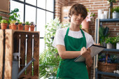 młody blondynka człowiek kwiaciarnia gospodarstwa doniczka roślin w kwiaciarnia