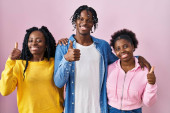 Grupa trzech młodych czarnych ludzi stojących razem nad różowym tle zaskoczony wskazując palcem w bok, otwarte usta zdumiony wyraz.