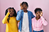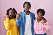 Zdjęcie "Grupa trzech młodych czarnych ludzi stojących razem nad różowym tle zaskoczony wskazując palcem w bok, otwarte usta zdumiony wyraz. " może być wykorzystywane do celów osobistych i komercyjnych zgodnie z warunkami zakupionej licencji Royalty-free. Obraz jest dostępny do pobrania w jakości wysokiej rozdzielczości do 5760x3840.