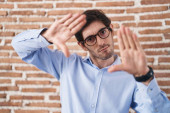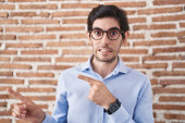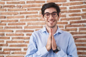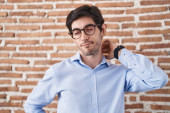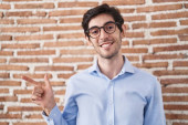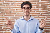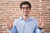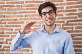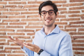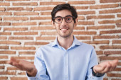 Młody Hiszpan stojący nad murem z cegły, uśmiechnięty z otwartymi ramionami jako przyjazne powitanie, pozytywne i pewne pozdrowienia