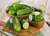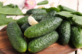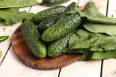 Deska drewniana ze świeżymi ogórkami do konserwacji na stole