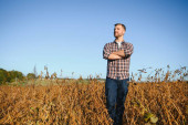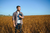 Rolnik pracuje na polu zasianym wiosną. Agronom chodzi po ziemi, oceniając zaorane pole jesienią. Rolnictwo. Inteligentne technologie rolnicze