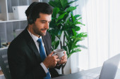 Manager biura operatora call center siedzi na biurku z kawą podczas pracy na laptopie. Pracownik biurowy noszący słuchawki i czarny garnitur pracujący nad obsługą klienta lub telemarketingiem. żarliwy