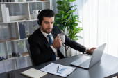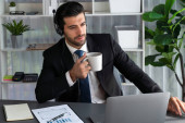 Zdjęcie "Manager biura operatora call center siedzi na biurku z kawą podczas pracy na laptopie. Pracownik biurowy noszący słuchawki i czarny garnitur pracujący nad obsługą klienta lub telemarketingiem. żarliwy" może być wykorzystywane do celów osobistych i komercyjnych zgodnie z warunkami zakupionej licencji Royalty-free. Obraz jest dostępny do pobrania w jakości wysokiej rozdzielczości do 5760x3840.