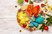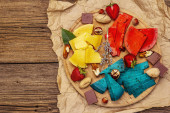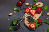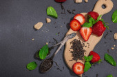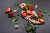 Odświeżający letni drink. Suche liście herbaty, świeże owoce i zioła. Zestaw składników do przygotowania herbaty, twarde światło, ciemny cień. Ciemny kamień beton tło, płaski leżak, widok z góry