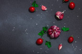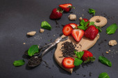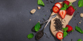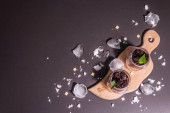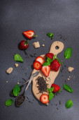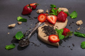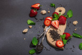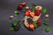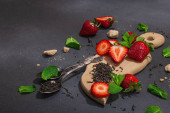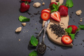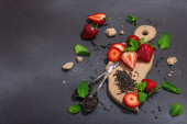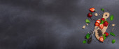 Odświeżający letni drink. Suche liście herbaty, świeże owoce i zioła. Zestaw składników do przygotowania herbaty, twarde światło, ciemny cień. Ciemny kamień beton tło, płaski leżak, widok z góry