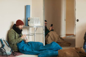 Portret młodej kobiety opatrującej głowę rannego młodzieńca w schronisku dla uchodźców, przestrzeń kopiująca