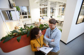 Zdjęcie "Portret dwóch współpracowników rozmawiających na balkonie w biurowcu z nowoczesnym designem architektonicznym, przestrzeń do kopiowania" może być wykorzystywane do celów osobistych i komercyjnych zgodnie z warunkami zakupionej licencji Royalty-free. Obraz jest dostępny do pobrania w jakości wysokiej rozdzielczości do 5760x3840.