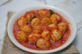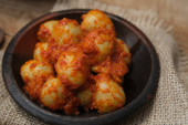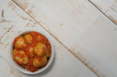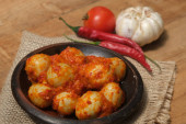 Telur Balado Tomat lub Pikantne Jaja, tradycyjne popularne indonezyjskie jedzenie z gotowanych jaj z pastą pomidorową i chili lub sambal, serwowane w ceramice na drewnianym stole. Czosnek, pomidor, chili.