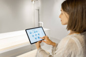 Zdjęcie "Kobieta posiada cyfrowy tablet z uruchomionym programem inteligentnego domu, sterujący inteligentnymi urządzeniami kuchennymi. Zbliżenie na ekranie. Pojęcie nowych technologii zapewniających komfort życia" może być wykorzystywane do celów osobistych i komercyjnych zgodnie z warunkami zakupionej licencji Royalty-free. Obraz jest dostępny do pobrania w jakości wysokiej rozdzielczości do 5760x3840.