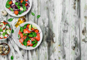 Sałatka jarzynowa. Sałatka z pomidorów, ogórków i jaj przepiórczych oliwą z oliwek. Na tle rustykalnym.