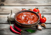 Zdjęcie "Sos pomidorowy w misce z liściem laurowym, czosnkiem i pomidorami. Na drewnianym tle" może być wykorzystywane do celów osobistych i komercyjnych zgodnie z warunkami zakupionej licencji Royalty-free. Obraz jest dostępny do pobrania w jakości wysokiej rozdzielczości do 5760x3840.