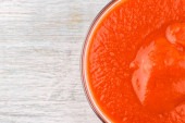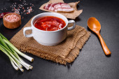 Pyszne świeże gazpacho z okruszkami chleba, solą i przyprawami w ceramicznej płycie na ciemnym betonowym tle