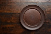 Drewniana płyta. Pusty okrągły drewniany talerz z naprkin na szarym tle kamienia, widok z góry