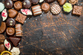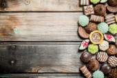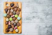 Czekoladowe słodkości na płycie. Na tle drewnianych.