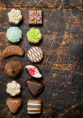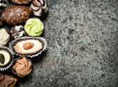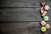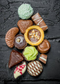 Słodycze czekoladowe z orzechami i różnymi farszami. Na tle drewnianych.