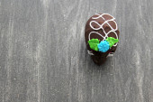 Słodycze czekoladowe z orzechami i różnymi farszami. Na tle drewnianych.