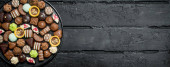Czekoladki na tacy. Na czarnym tle rustykalnym.