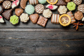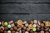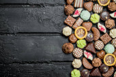 Czekoladki cukierki z różnymi nadzieniami. Widok z góry.