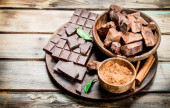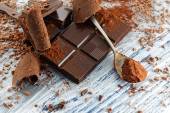 Proszek kakaowy z czekoladą. Na tle drewnianych.
