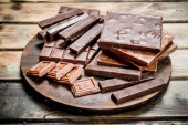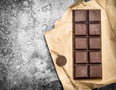 Czekoladowe paski na papierze. Na drewnianym tle.
