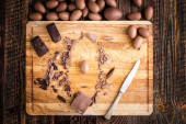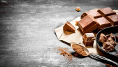 Czekoladowe tło. Czekolada z kakao i cynamon. Na tle drewnianych.