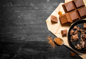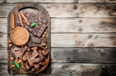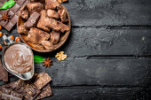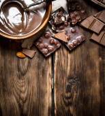 Kawałki czekoladę w misce. Na tle drewnianych.
