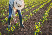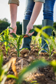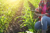 Biały hodowca kukurydzy z tabletem kontrolujący łodygi na polu