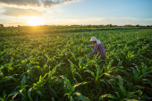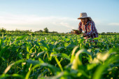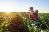 Biały hodowca kukurydzy z tabletem kontrolujący łodygi na polu