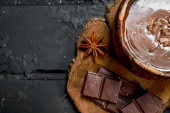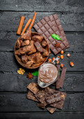 Czekoladowe tło. Zróżnicowany asortyment czekolady pastą. Na czarnym tle rustykalnym.