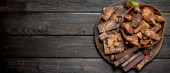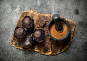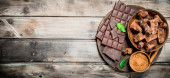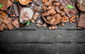 Czekoladowe tło. Zróżnicowany asortyment czekolady pastą. Na czarnym tle rustykalnym.