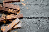 Ciemna czekolada z kakao. Na czarnym tle rustykalnym.