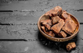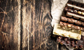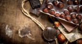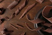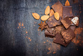 Asortyment różnych czekolady z orzechami i cynamon. Na tle drewnianych.