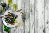 Świeże owoce morza, małże w białym winie. Na czarnym tle rustykalnym