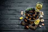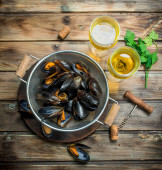 Świeże owoce morza, małże z pietruszką i białym winem. Na tle rustykalnym.