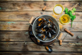 Świeże owoce morza, małże z pietruszką i białym winem. Na tle rustykalnym.