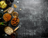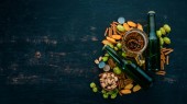 Owoce świeże małże z okulary z białego wina. Na tle rustykalnym.